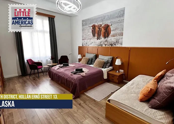 Das Little Americas Alaska Apartment bietet eine voll ausgestattete Küchenzeile an, die für den Komfort der Gäste einen Herd und einen Geschirrspüler bereitstellt. Zu den nahegelegenen U-Bahn-Stationen gehört die U-Bahn-Station Kossuth Lajos tér, die in ungefähr 10 Gehminuten Entfernung von der Unterkunft ist.